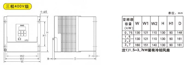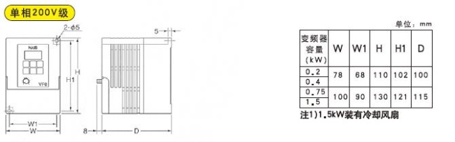 ·200V系列型:0.4-1.5kW電阻內藏(0.2kW電路沒有制動電路和制動電阻;0.4kW是外部設置的同包裝電阻)