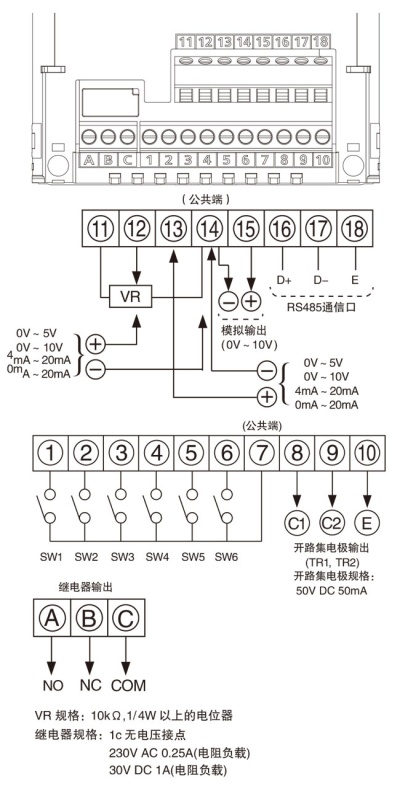 外控操作模擬設(shè)定信號: ? 電位器(10kΩ、1/4W以上) ? 0V-5V DC、0V-10V DC ? 4mA-20mA、0mA-20mA |