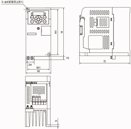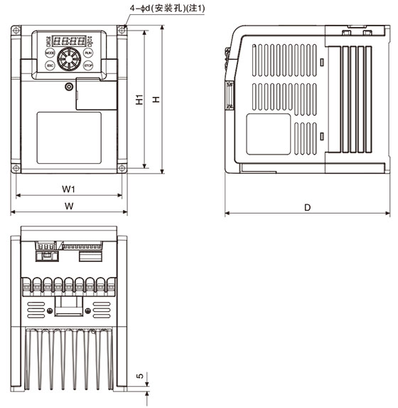 | 變頻器容量 | W1 | W | H1 | H | D | Φd |