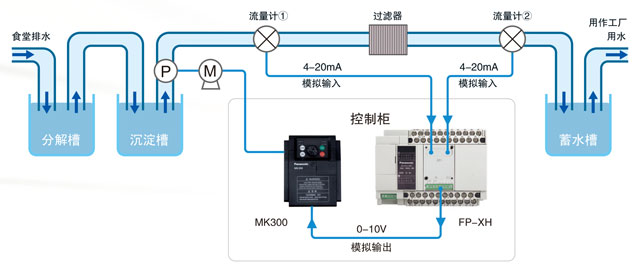 ■對工廠內(nèi)食堂排水進(jìn)行細(xì)菌分解,用泵汲取沉淀槽內(nèi)蓄積的清水,經(jīng)過過濾器過濾后,作為工業(yè)用水送至蓄水槽。