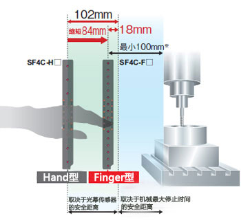 與SF4C系列Hand型(SF4C-H□)相比,取決于光幕傳感器的安全距離可縮短84mm,可縮短裝置 的進(jìn)深和護(hù)板。