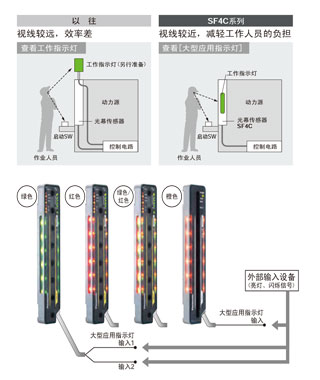 配置于光幕傳感器中央部3面的高亮度LED指示燈根據(jù)外部輸入點(diǎn)亮為綠色·紅色。無需另外準(zhǔn)備作業(yè)指示燈,裝置更加簡(jiǎn)潔。 ※ 可使用手動(dòng)控制器SFC-HC(另售)來更改SF4C系列的亮燈條件,與大型指示燈輸入線無關(guān),還可與內(nèi)部動(dòng)作聯(lián)動(dòng)亮燈。