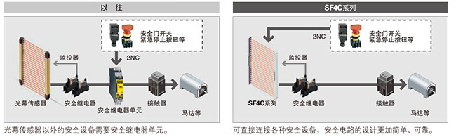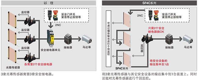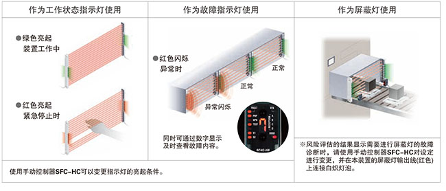 光幕傳感器本體上可以連接緊急停止開關(guān)、安全門開關(guān)等的輸出接點(diǎn)。此外,使用手動(dòng)控制器SFC-HC,可以對(duì)3套光幕傳感器進(jìn)行跨接配線,同時(shí)對(duì)安全輸出進(jìn)行集中控制。