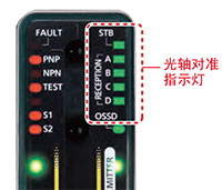 將光幕傳感器的光軸分為4等分進(jìn)行顯示,因此入光位置一目了然。作為光軸對(duì)準(zhǔn)基準(zhǔn),最下端(或者最上端)的光軸對(duì)準(zhǔn)后,LED將會(huì)閃爍為紅色。之后,光軸對(duì)準(zhǔn)的部分將會(huì)依次亮為紅色,所有光軸均入光后,所有LED將會(huì)亮為綠色。帶有入光量指示燈(STB),可實(shí)現(xiàn)更加穩(wěn)定的安裝。