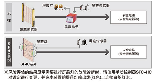 光幕傳感器本體內(nèi)置屏蔽控制功能,僅在人體通過時(shí)使生產(chǎn)線停止,而工件通過時(shí)則可照常運(yùn)行。屏蔽傳感器與屏蔽燈可直接連接至光幕傳感器。此外,還可將大型應(yīng)用指示燈作為屏蔽燈使用,減少配線故障,同時(shí)實(shí)現(xiàn)安全性、生產(chǎn)性的提高和成本下降。
