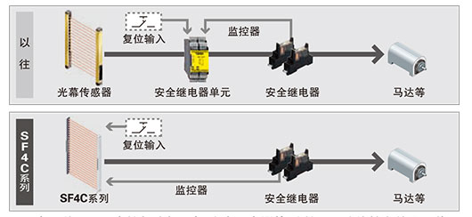 光幕傳感器本體內(nèi)置安全繼電器單元的功能,可對(duì)外部設(shè)備進(jìn)行監(jiān)控(繼電器熔敷監(jiān)視等),并具備聯(lián)鎖功能等。因此無需使用安全繼電器即可構(gòu)建安全電路,同時(shí)減小控制柜的體積,實(shí)現(xiàn)成本節(jié)約。