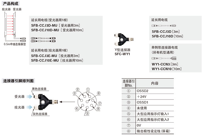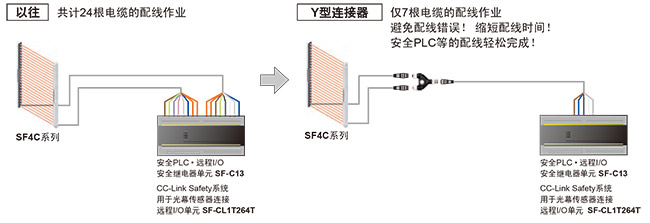通過使用Y型連接器,將電源及安全輸出等最基本所需的線集中到1根電纜上。配線工時(shí)減到最少。大幅減少了施工時(shí)間,避免配線錯(cuò)誤。