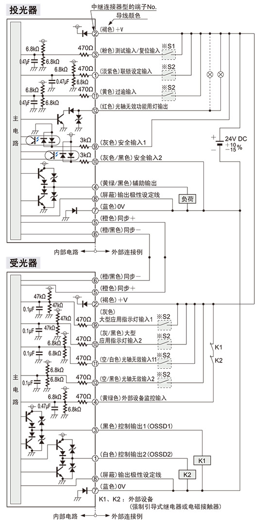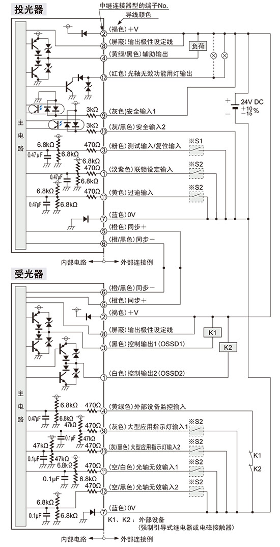 ?將光幕傳感器控制輸出OSSD1與OSSD2分別連接至S1、S2。