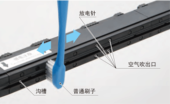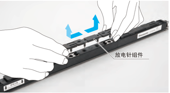 組件化,可簡(jiǎn)單地更換放電針將放電針實(shí)現(xiàn)組件化(4根針一套),從而大幅簡(jiǎn)化更換操作。根據(jù)組件上的箭頭向兩側(cè)滑動(dòng),即可簡(jiǎn)單地完成拆卸操作。 |